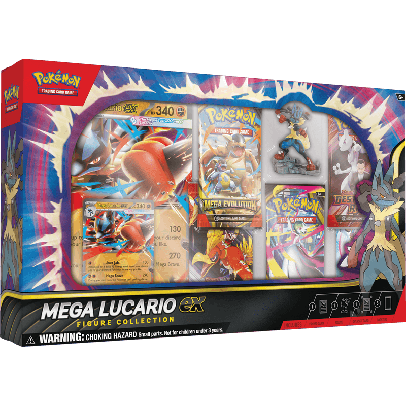 ¡Mega-Lucario ex doblega a sus rivales sin piedad y reparte la Energía descartada entre tus Pokémon en Banca! Incorpora este poder descomunal a tu colección con 1 carta promo holográfica lista para jugar, 1 carta promo jumbo y 1 detallada figura de Mega-Lucario en plena acción. Encontrarás muchos más Pokémon fantásticos dentro del montón de sobres de refuerzo incluidos.