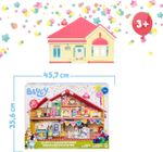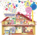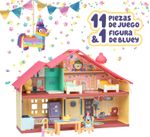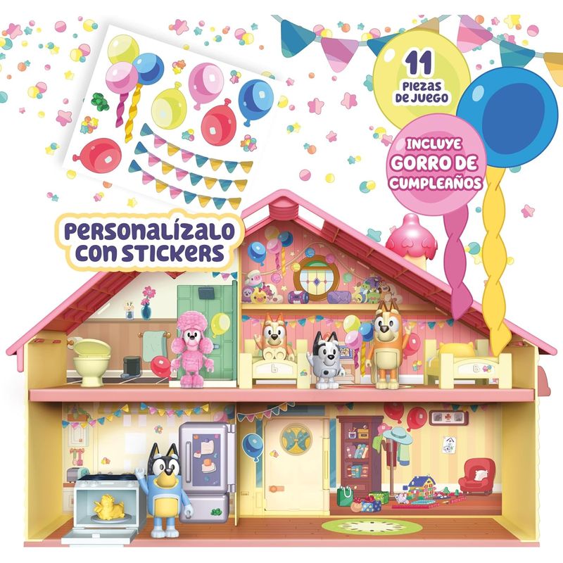 El juego incluye 11 piezas de juego, incluido un horno con tu propio pastel de pato, una plantilla de stickers para decorar la casa antes de que lleguen tus invitados. ¡El juego incluye una figura exclusiva de Bluey de 6,3 cm con un sombrero de fiesta!"