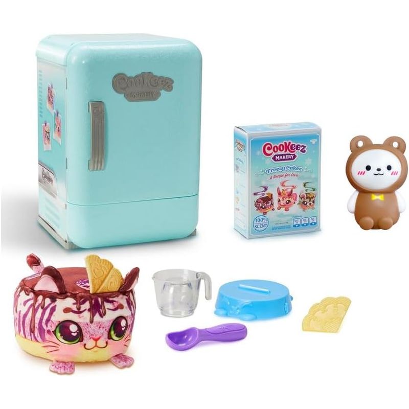 Cookeez Makery Refri Pastel Helado permite a los niños crear un peluche sorpresa aromático en forma de un delicioso postre congelado. Primero, mezclan los ingredientes, luego usan el molde y las decoraciones para hacer su Refri Pastel. Después, lo colocan en el frigorífico y, en 20 segundos, escuchan un "ding" al abrirlo y descubrir un peluche interactivo y aromático. Hay 3 peluches para crear: Strawberry Unicake, Minty Polar Bear y Tiger Berry Ripple. El proceso se puede repetir para más sorpresas.