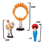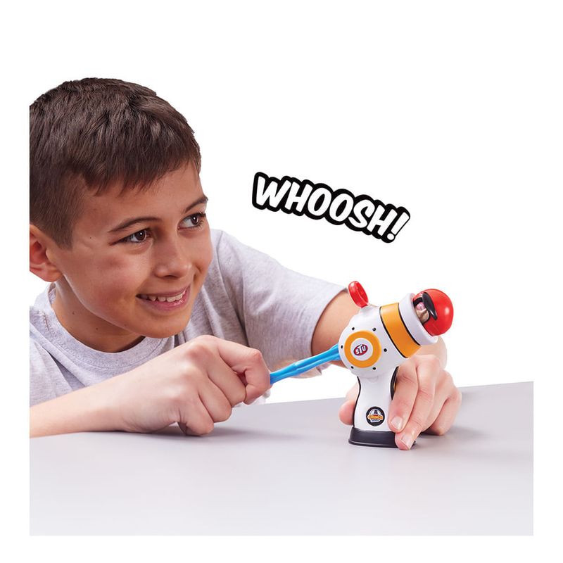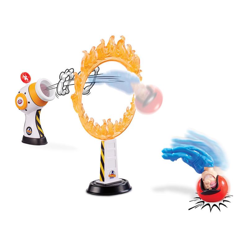 Cañón de dos partes: un barril con empuñadura y una base ajustable. Stu, con cabeza sólida y cuerpo elástico, se carga en el cañón para disparar. Incluye un aro de fuego como objetivo y dos miniobjetivos.