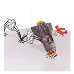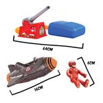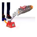 Cohete de espuma y una figura conectados a un lanzador con bolsa de aire. Ensambla el cohete, ajústalo al lanzador, regula el ángulo y pisa fuerte. Al impactar, se desarma. Incluye un objetivo con resorte para saltos y lanzamientos.