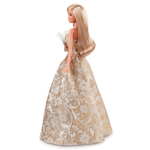 La muñeca Barbie Holiday 2025 brilla como una estrella dentro y fuera de su empaque. Con una hermosa combinación de estampado damasco en plata y dorado en la falda, Barbie atrae todas las miradas con su deslumbrante vestido sin tirantes, adornado con un volante de tul blanco en el cuello. Barbie complementa su impresionante vestido con aretes dorados colgantes y tacones dorados perlados. Su largo y hermoso cabello castaño oscuro y su maquillaje realzan su look clásico. Presentada en un empaque ideal para exhibición, esta muñeca de colección está pensada para fans a partir de 6 años. Incluye base para muñeca y certificado de autenticidad. La muñeca no puede mantenerse de pie por sí sola. Los colores y decoraciones pueden variar.