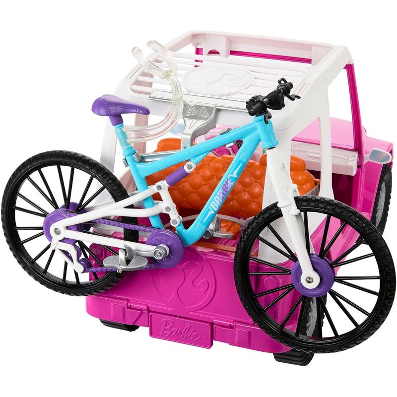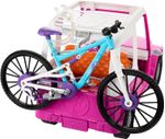 ¡Un día al aire libre con el set de montaña de Barbie! Engancha su bicicleta en la parte trasera de su auto rosa con el portabicicletas y emprende la aventura.