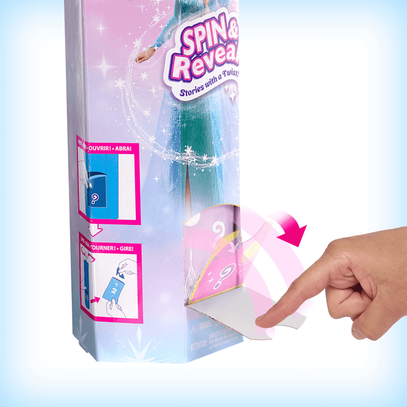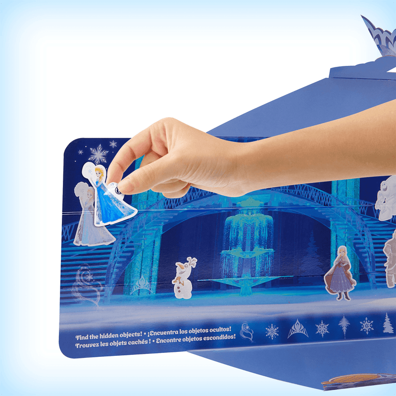 Elsa, la reina de Frozen de Disney, da un giro mágico con este set de Disney Frozen Spin & Reveal, experiencia unboxing. Primero, abre la solapa del castillo para descubrir un increíble escenario donde podrás colocar diversas calcomanías. A continuación, encontrarás 5 bolsas misteriosas dentro del empaque, cada una con un accesorio y una calcomanía. La revelación final es una muñeca de Elsa con un precioso atuendo inspirado en la película. Los niños y las niñas también pueden decorar el escenario con las calcomanías y encontrar los objetos ocultos. La muñeca no puede mantenerse de pie por sí sola. Los colores y las decoraciones pueden variar.