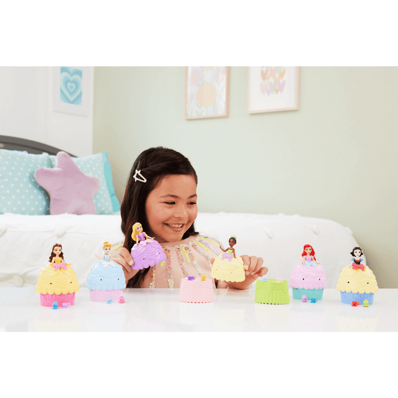 La experiencia del “unboxing” ahora es perfecta para la hora del té gracias al juguete Cupcake Transformable a Falda de la línea Disney Princesa. Los adorables pastelitos perfumados esconden varias sorpresas en su interior, entre estas una muñequita Disney Princesa y dos accesorios para la hora del té. Después de revelar sus sorpresas, los niños pueden usar la parte superior del pastelito como una hermosa falda para la muñeca, mientras que la parte inferior se convierte en la mesa perfecta para tu fiesta de té. Cada muñeca se vende por separado y está sujeta a disponibilidad. Las muñecas no se pueden mantener de pie por sí solas. Los colores y las decoraciones pueden variar.