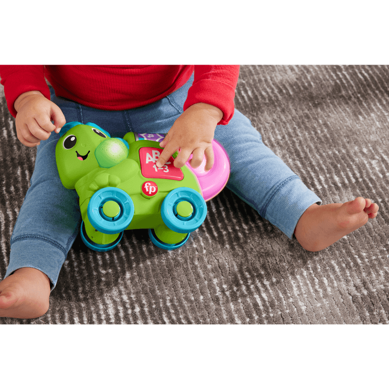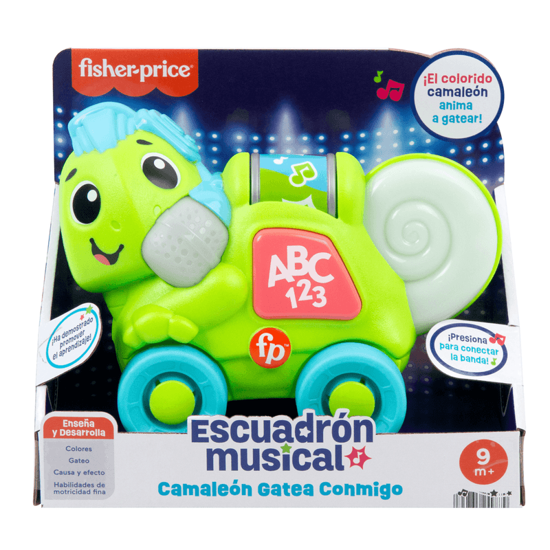 El juguete interactivo para bebés Escuadrón Musical Camaleón Gatea Conmigo de Fisher-Price es un divertido vehículo empujable y un juguete musical ¡al mismo tiempo! Cuando los niños hacen girar el colorido rodillo o presionan el botón lateral, la cola del camaleón y el micrófono se iluminan para sincronizarse al ritmo de divertidas canciones, sonidos y frases sobre los colores y mucho más. Envía al Camaleón a rodar para que tu pequeño se anime a gatear y perseguir a su amigo. Además, cuando el Camaleón se encuentra con otros miembros de la banda Link Squad, ¡se iluminan para cantar y tocar juntos y así tener un aprendizaje más divertido! Los juguetes adicionales se venden por separado y están sujetos a disponibilidad. Los juguetes Link Squad de Fisher-Price solo son compatibles con otros de la misma línea.