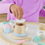 Los niños en edad preescolar pueden servir una taza a su mejor amigo y compartir postres con este Juego de Té de Madera que incluye tazas, pastelitos y mucho más.