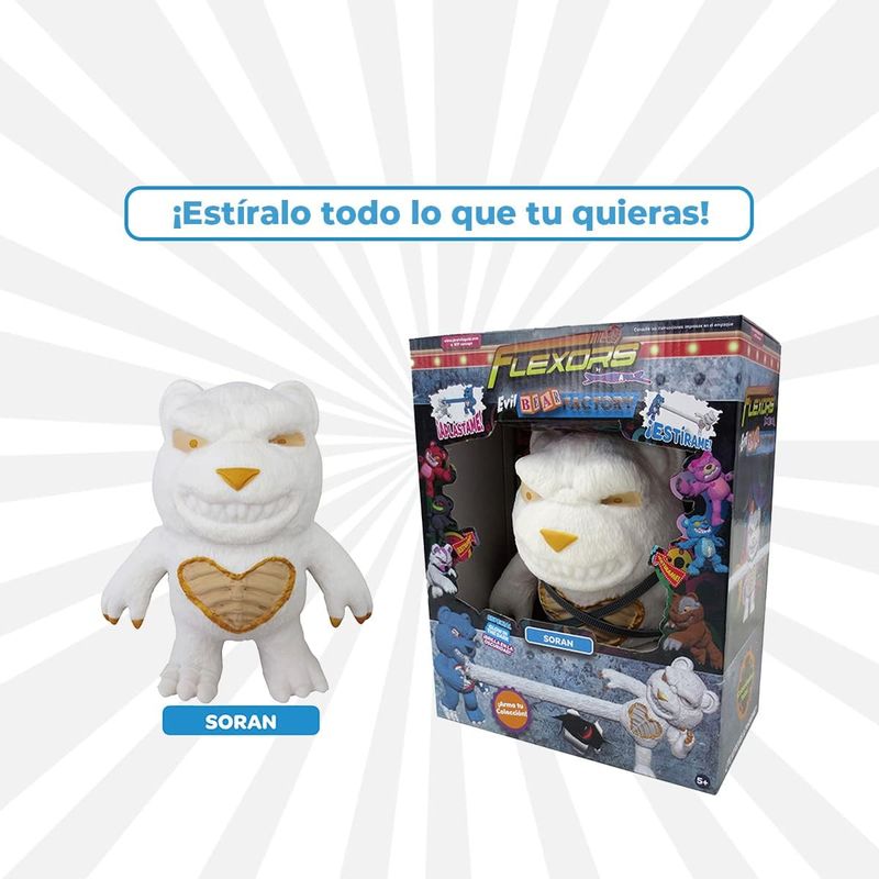 El Evil Bear Soran de Flexor es un muñeco elástico de 8" con un diseño imponente y detalles impactantes. Se estira y retuerce, ideal para juegos de acción y aventuras emocionantes.