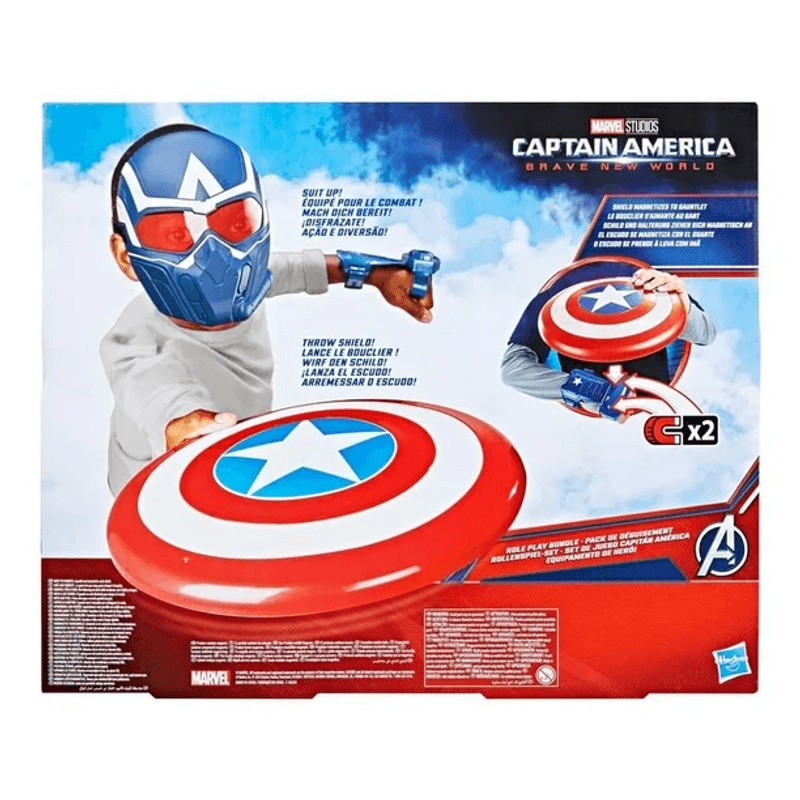 ¡La mejor de las experiencias de juego Marvel te espera con este Set de juego Capitán América! Este set para juego de rol incluye una máscara, un escudo y un guante para que los más pequeños puedan imaginar que se equipan para la batalla como Sam Wilson. ¡Lánzale el escudo a los villanos como el Capitán América! El escudo se pega al guante por medio de un imán para que puedas usarlo en la muñeca e imaginar que desvías ataques imaginarios. Tanto la máscara como el guante cuentan con bandas ajustables para que la mayoría de los niños y niñas a partir de 5 años puedan usarlos cómodamente. Los artículos para juego de rol también son excelentes accesorios para los disfraces del Capitán América, para Halloween o para las fiestas con temática de superhéroes. ¡Busca otros artículos para juego de rol, figuras y vehículos Marvel para más acción y aventuras! (Cada una se vende por separado. Sujeto a disponibilidad).