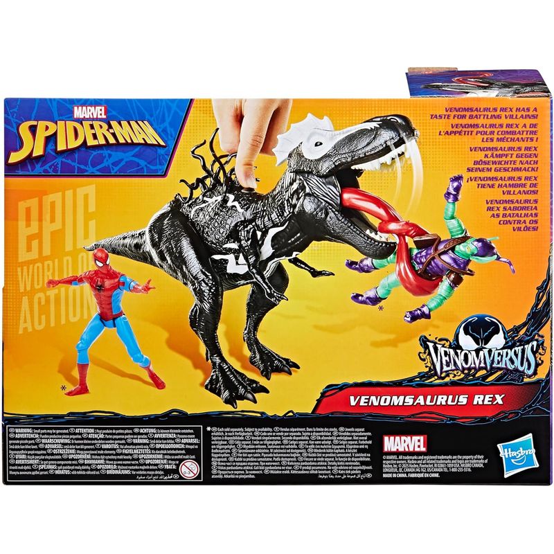 ¡Venomsaurus Rex tiene hambre de villanos! Los niños y las niñas a partir de 4 años podrán lanzarse a la acción arácnida para enfrentar a los villanos con la figura de acción Marvel Spider-Man de Venomsaurus Rex. Haz saber a los malhechores que vienes por ellos con este juguete de 40 cm de Spidey, el cual cuenta con el diseño y los detalles blancos y negros de Venom. Presiona el botón de la espalda de Venomsaurus Rex para abrir su boca y libéralo para dejar que se cierre. Este juguete Marvel de gran tamaño cuenta con una lengua suave y elástica con la que puedes enredar y atrapar a las figuras de la línea Epic World of Action. ¡Tienes incontables maneras de jugar con esta figura Spider-Man de dinosaurio! Los niños y las niñas a partir de 4 años podrán crear sus propias escenas interactivas de juego con otros juguetes y figuras de la línea Epic World of Action de Marvel. (Se venden por separado. Sujeto a disponibilidad). Estos juguetes infantiles de superhéroes Marvel son excelentes regalos para niños y niñas.