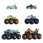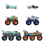 Recrea tus momentos favoritos de la serie de YouTube Kids Hot Wheels Monster Trucks Sharks vs. Dinos con un multipack que incluye seis vehículos de diferentes tamaños. Vive la batalla Sharks vs. Dinos con los Big Rigs Tiger Shark y Mega-Wrex, con impresionantes seis ruedas. Ten cuidado con los dos Monster Trucks a escala 1:64, Great Bite y Rageasaur, que están listos para unirse a la acción. También incluye dos autos diecast Hot Wheels a escala 1:64: Veloci-Racer y Shark Bite. Las pistas adicionales se venden por separado y están sujetas a disponibilidad. Los colores y las decoraciones pueden variar.