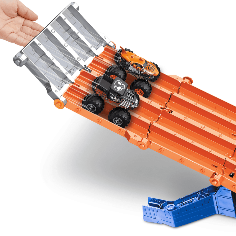 Los Monster Trucks Mega-Wrex y Tiger Shark se enfrentan en una carrera cuesta abajo, donde la pista decide al azar quién ganará y quién volcará en un increíble choque. Coloca los vehículos a escala 1:64 incluidos en la posición de inicio y, al levantar la pista, los enviarán a toda velocidad hacia la meta. La pista deja pasar a uno de los vehículos, mientras que el otro volcará con la pista hacia un espectacular choque. El set de juego Carrera de Destrucción se puede conectar a otras pistas Hot Wheels que cuenten con la tecnología de Pista de Conexión Rápida Hot Wheels, también es compatible con otros autos y vehículos Hot Wheels a escala 1:64. Se venden por separado y están sujetos a disponibilidad. Los colores y las decoraciones pueden variar.