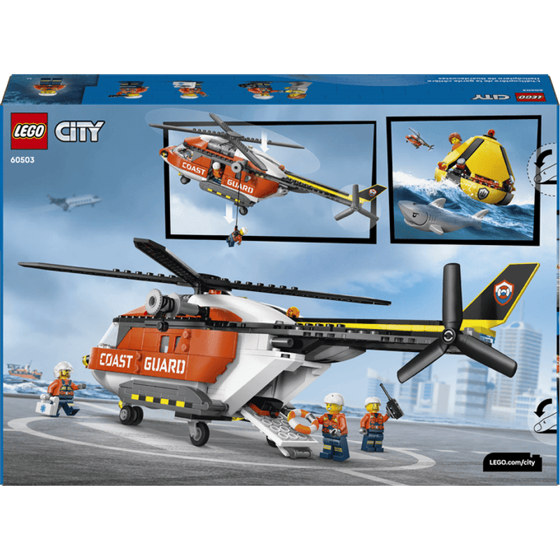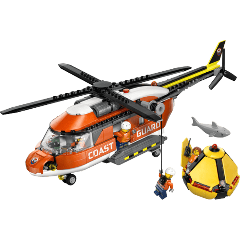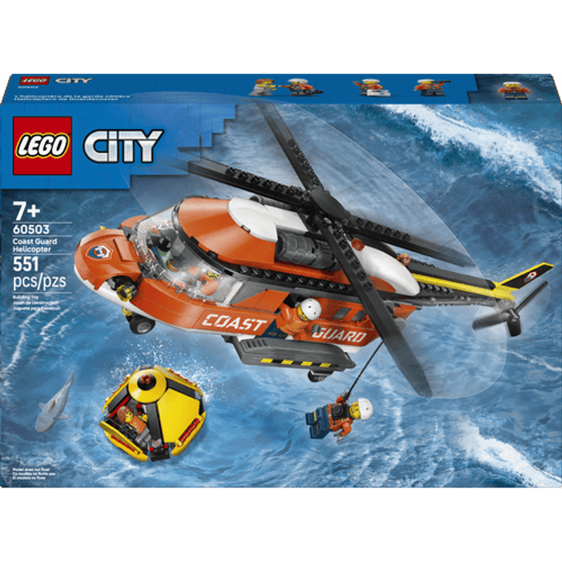 Únete a la guardia costera en el Helicóptero de Guardacostas LEGO® City, diseñado para misiones de rescate arriesgadas. Carga el equipo, cierra las puertas y despega. Baja a un tripulante hasta la cápsula de rescate con el malacate. Usa tu habilidad de piloto para evitar las aguas infestadas de tiburones y subir al civil a bordo antes de regresar a la base para volar hacia la siguiente aventura.