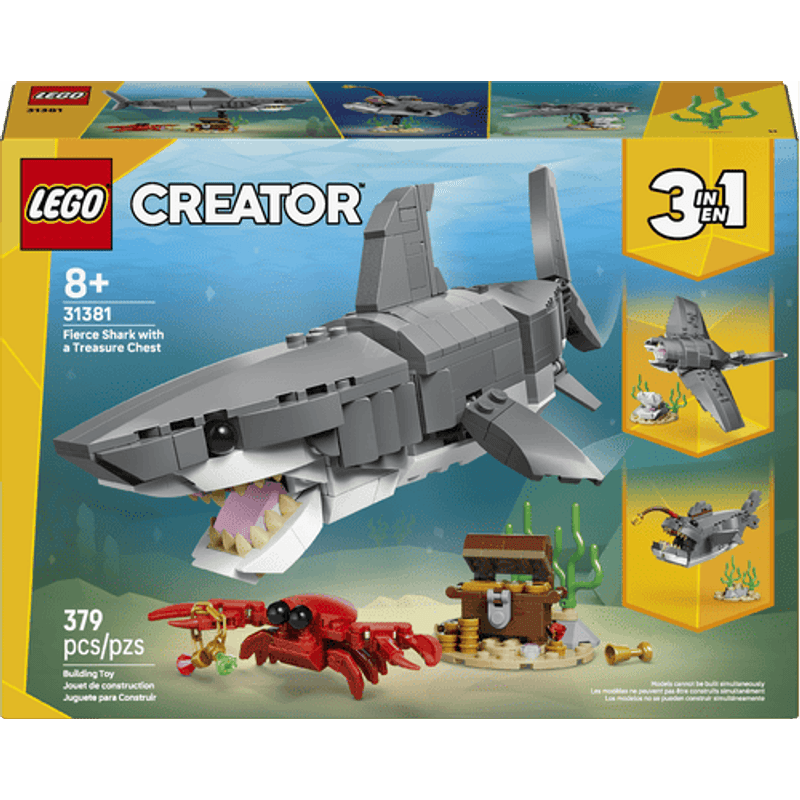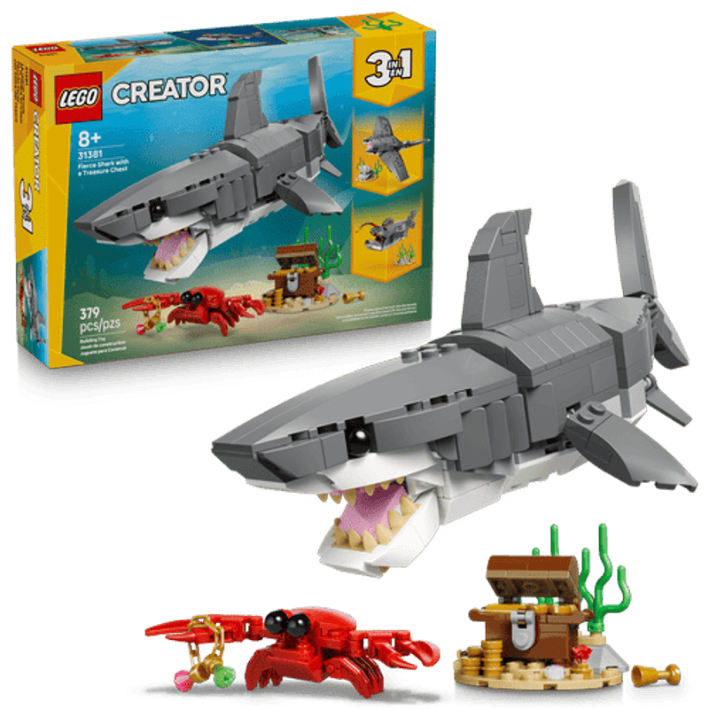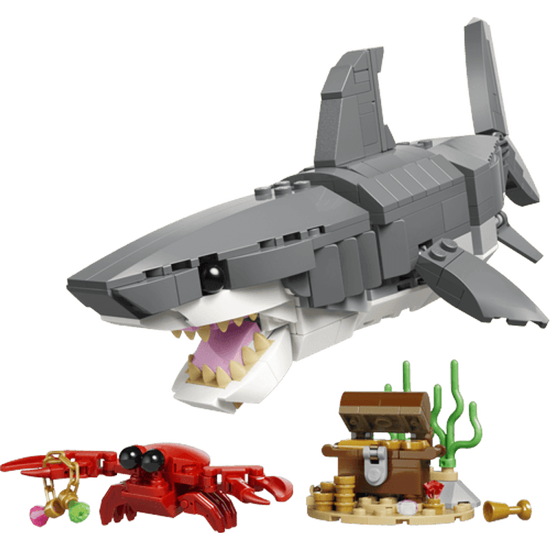 ¡Llega al fondo del océano para vivir divertidas aventuras con 3 animales marinos LEGO®! Ayuda a un tiburón a proteger un cofre del tesoro que le interesa muchísimo a un entrometido cangrejo. Conviértelo después en un pez abisal que mueve la boca y las aletas, o transfórmalo en una mantarraya con una concha de almeja. ¿Qué vas a construir? Tú decides con este juego “3 en 1” supergenial.