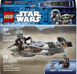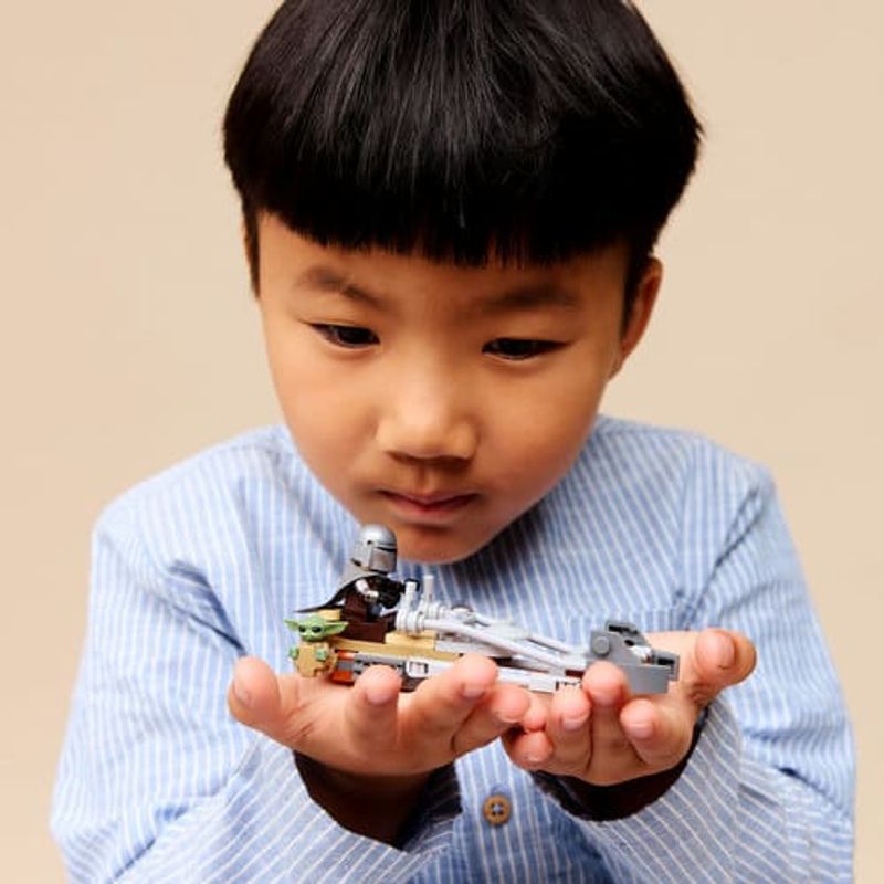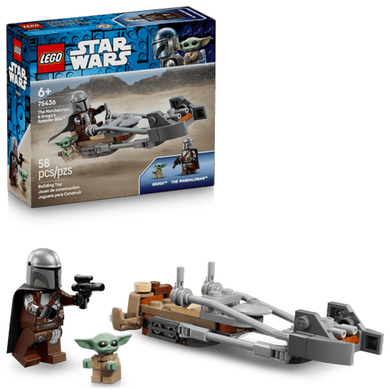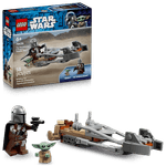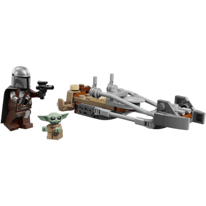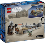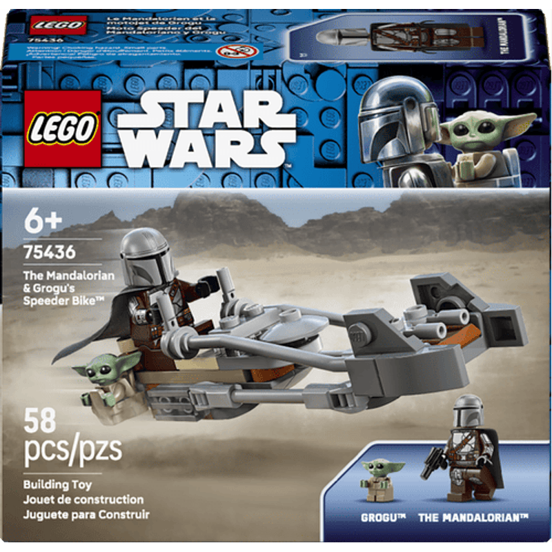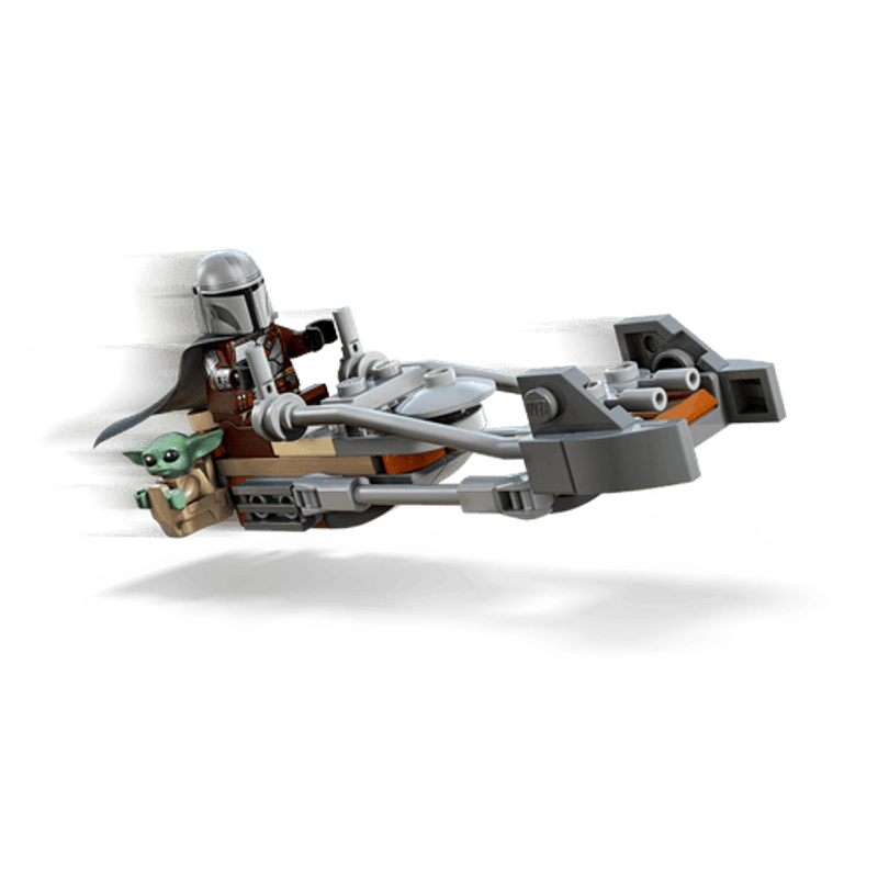 ¡Acompaña al Mandaloriano y Grogu a vivir emocionantes aventuras en Tatooine! Engancha el rifle bláster del Mandaloriano a la parte trasera de la moto speeder. Ayuda a Grogu a meterse en la bolsa que va sujeta al costado del impresionante vehículo. ¡Sube en el asiento del conductor con el Mandaloriano y recorre el planeta desértico a toda velocidad!