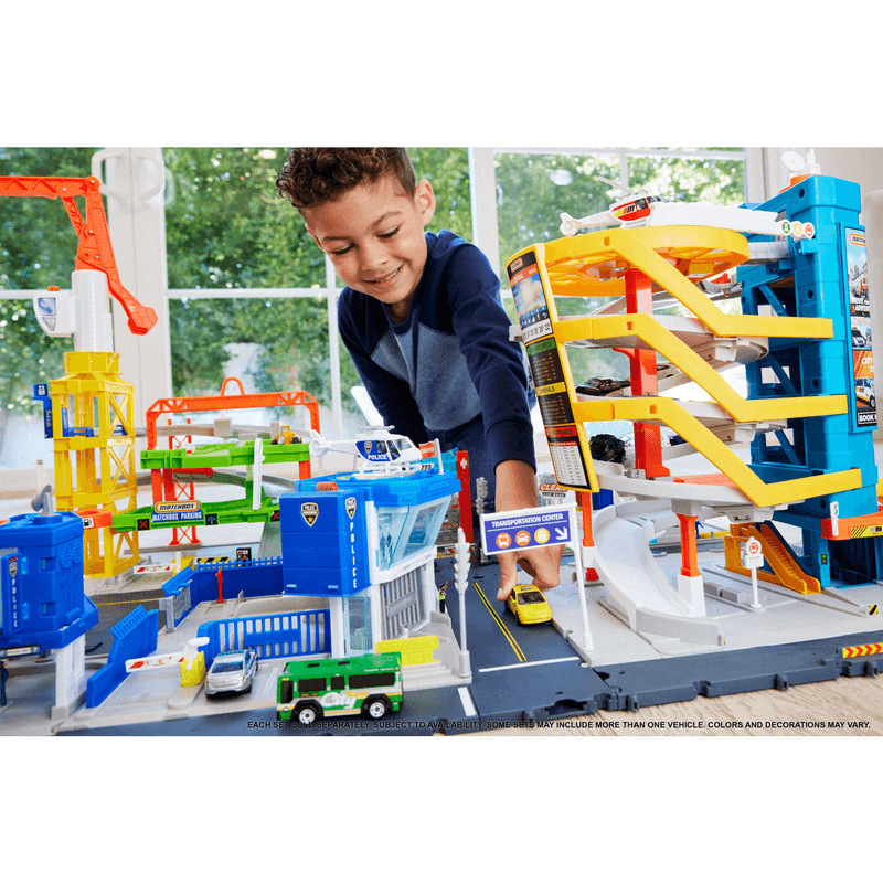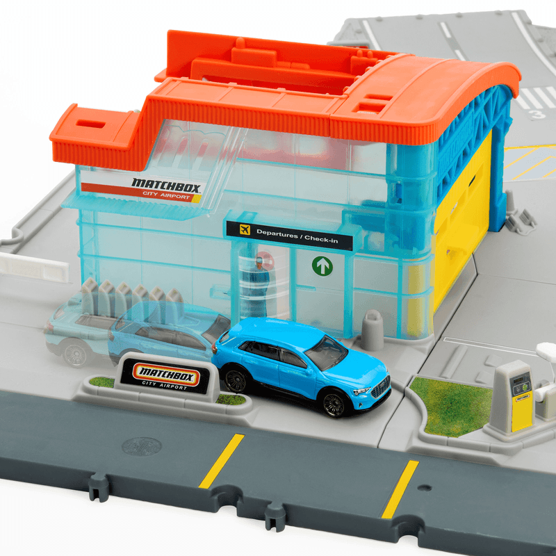 Los niños podrán imaginar increíbles historias con el set de juego de Aeropuerto de Matchbox. El set incluye un auto Audi e-tron diecast y un avión de plástico. Los niños pueden abrir la puerta del hangar para salir a la pista y despegar. También pueden mover la palanca para poner el avión en movimiento y volar alrededor de la torre hasta alcanzar la altitud de crucero; luego con solo pulsar un botón, desciende automáticamente hasta aterrizar ¡justo como en la vida real! Conduce el auto para dejar a los pasajeros y que un auxiliar llegue con un carrito de equipaje para ayudarlos. Guarda el avión en el hangar. Los colores y las decoraciones pueden variar.