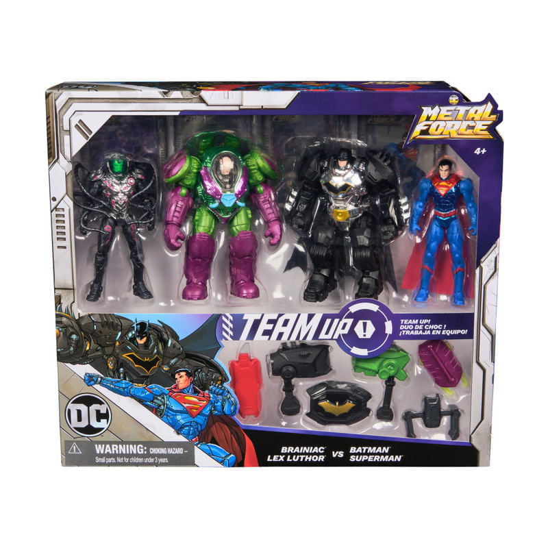 DC Comics,Team Brainiac y Lex Luthor vs Batman y Superman,figuras de acción con accesorios,incluye tarjetas de personajes,para niños y niñas a partir de 4 años