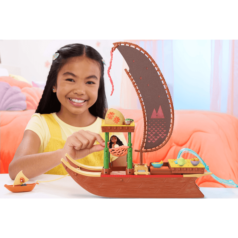 Inspirado en la película de Disney Moana 2, el set de juego Bote de Aventuras con Mini Muñeca y Accesorios está listo para zarpar más allá de Motunui y explorar las maravillas del océano. El set cuenta con seis áreas de juego transformables para una diversión sin límites, como un tobogán de agua plegable, una cocina oculta, una hamaca, una plataforma, una cabaña de animalitos y un barco de animalitos. Moana y su amiga, la gallina Heihei se reúnen en la canoa flotante de casi 2 pies de largo para divertirse en tierra, mar o bañera. El set también incluye cocos, naranjas, plátanos y otros accesorios para esos largos viajes que abren el apetito. La muñeca no se puede mantener de pie por sí sola. Los colores y las decoraciones pueden variar.