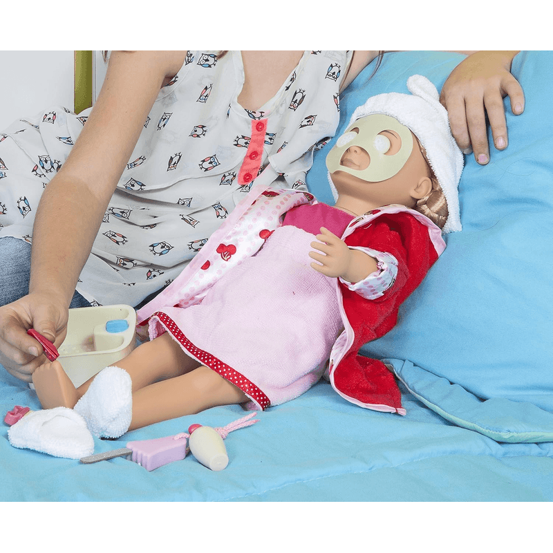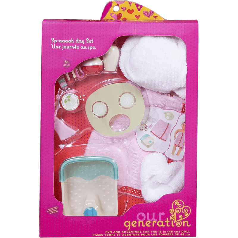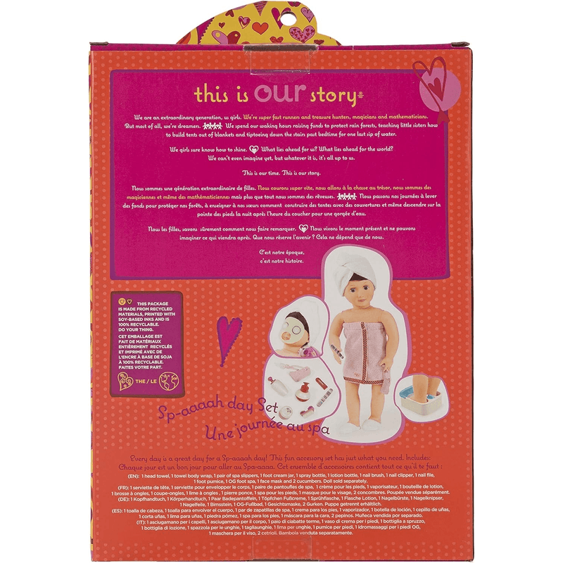¡Disfruta de tu día de spa con el set de Diversión de Día de Spa de Our Generation para muñecas de 18 pulgadas! Mimá a tus muñecas favoritas con una diadema y una toalla mientras aplicas una relajante mascarilla de pepino. No te olvides de las rodajas de pepino sobre los ojos. ¡Cuanto más fresco, mejor! Y nada es más relajante que un largo tratamiento de pies. Sumerge los dedos de los pies de tu muñeca en el baño de pies y empieza a relajarte. Accesorios temáticos como bombas de baño, limas de uñas, esmalte de uñas, cortauñas, frasco de crema y cepillo para pies abren muchas oportunidades para el autocuidado y dulces historias. Es una adición divertida a los sets y colecciones de cuidado de muñecas. Los accesorios para muñecas de Our Generation son un gran regalo para niños a partir de 3 años (también contiene piezas pequeñas), animándolos a imaginar sus propias historias únicas.