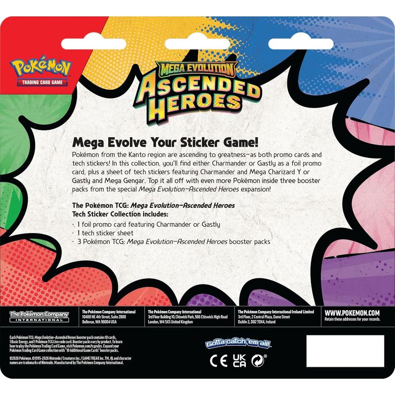 Producto enviado al azar según disponibilidad. "¡Megaevoluciona tu colección de calcomanías! Los Pokémon de Kanto ascienden triunfalmente a la cima como cartas promo y calcomanías. En esta colección, encontrarás a Charmander o a Gastly en forma de carta promo holográfica, así como 1 hoja con calcomanías para dispositivos de Charmander y Mega-Charizard o de Gastly y Mega-Gengar. Y por si esto fuera poco, ¡descubre aún más Pokémon en los 3 sobres de refuerzo de la expansión especial Megaevolución-Ascenso Heroico! La Colección con Calcomanías para Dispositivos de Megaevolución-Ascenso Heroico de JCC Pokémon contiene: • 1 carta promo holográfica de Charmander o Gastly • 1 hoja con calcomanías para dispositivos • 3 sobres de refuerzo de Megaevolución-Ascenso Heroico de JCC Pokémon"