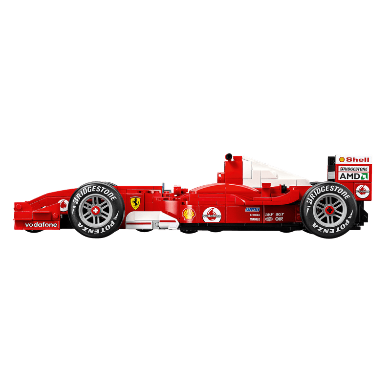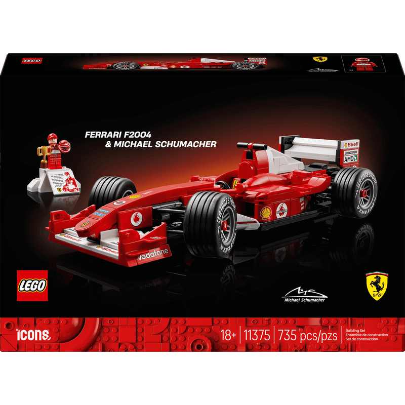Celebra la época dorada de la Formula 1 con el kit LEGO® Icons Ferrari F2004 y Michael Schumacher (11375). Crea una réplica a escala del auto de carreras que, con Michael Schumacher al volante, dominó la temporada 2004. El Ferrari incluye mecanismo de dirección, llantas ranuradas y detallado motor V10, además de una base de exhibición con datos y estadísticas del vehículo. La minifigura de Michael Schumacher cuenta con casco, trofeo y base en forma de podio con una imagen impresa y una cita del siete veces campeón del mundo.