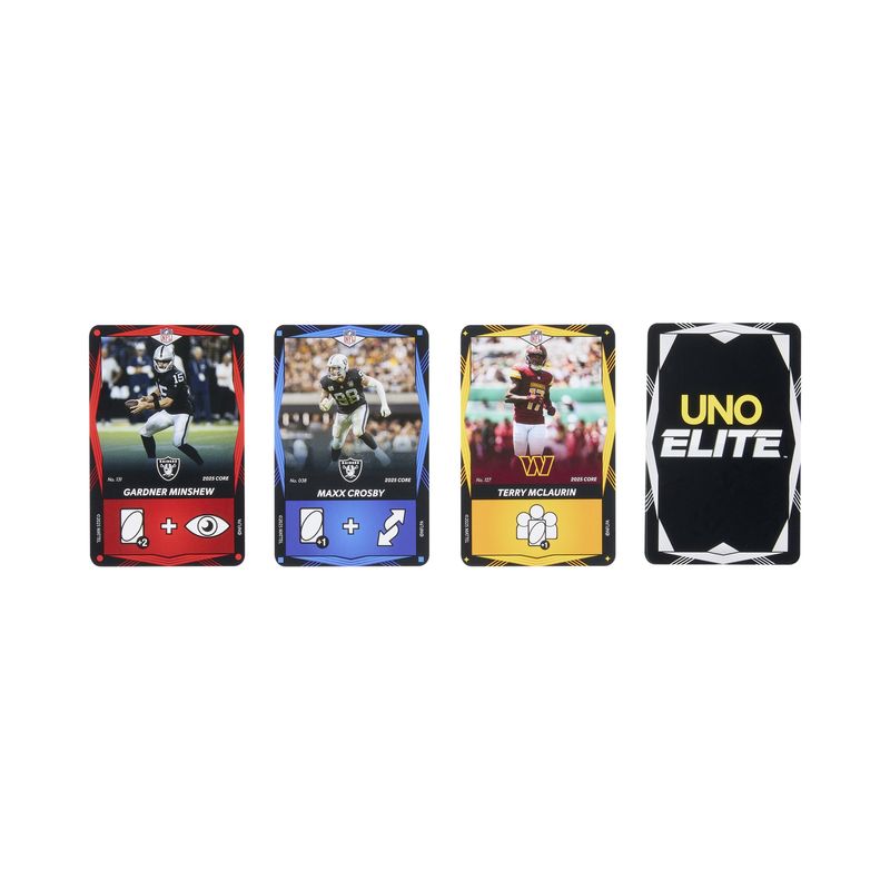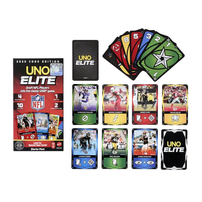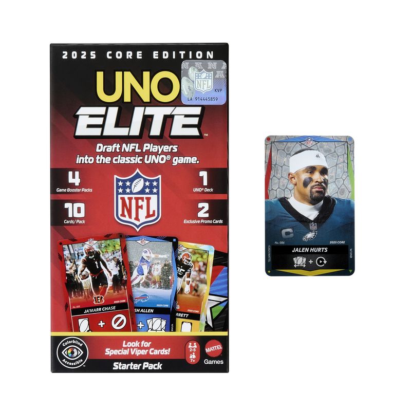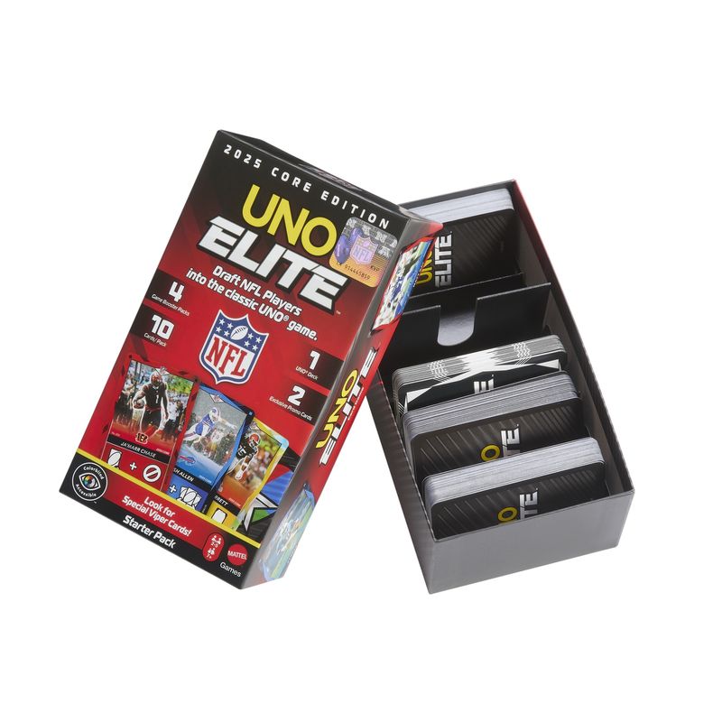 ¡Hay suficiente emoción para llenar el estadio con este juego de cartas UNO Elite NFL 2025 Core Edition con licencia oficial! La acción comienza con el Paquete Inicial, que incluye 112 cartas especiales de UNO, y se intensifica con cuatro Paquetes de Refuerzo y dos Cartas Promocionales. Cada Paquete de Refuerzo contiene 10 Cartas de Acción Elite, ¡para un total de 40! UNO Elite NFL se juega como el UNO clásico, pero las acciones como “Saltar” y “Reversa” están en las Cartas de Acción Elite, que presentan a jugadores favoritos de la NFL. Hay más de 2,000 de estas cartas para llevar las partidas de UNO Elite al siguiente nivel. Y cuando te quede la última carta, no olvides gritar: “¡Hut, hut, UNO!”. Este juego de cartas con temática deportiva es un regalo lleno de puntos para fans de la NFL y amantes de los juegos de cartas a partir de los 7 años. Los colores y decoraciones pueden variar.