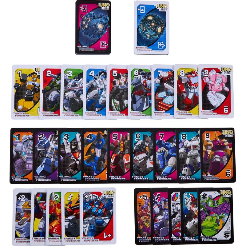 ¡UNO Transformers fusiona la emoción del clásico juego de cartas con el universo de los Autobots y Decepticons! Esta versión presenta cartas vibrantes con personajes y escenas icónicas de la saga, lo que hace que cada partida sea una aventura épica. Los jugadores compiten para deshacerse de todas sus cartas, combinando colores y números mientras utilizan cartas especiales para cambiar el rumbo del juego. Ideal para fans de todas las edades, es perfecto para disfrutar en familia o con amigos. ¡No olvides gritar "¡UNO!" al quedarte con una sola carta y lleva la batalla a la mesa!